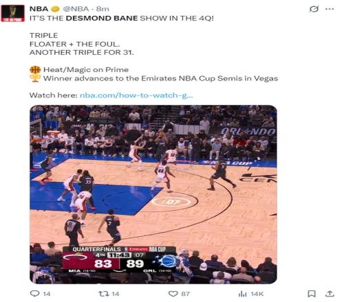 第三節(jié)的貝恩也很出色,單節(jié)7中4+三分2中2拿到10分2籃板1助攻,但他最高光的還是末節(jié)開場,他末節(jié)開場2分鐘里連拿9分,就連NBA官方都為貝恩唱贊歌。