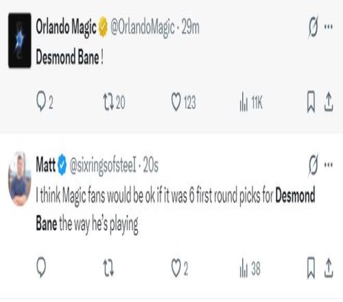 魔術(shù)記者馬特調(diào)侃:我覺得魔術(shù)隊(duì)球迷應(yīng)該能接受用六個首輪選秀權(quán)去換德斯蒙德-貝恩,他現(xiàn)在打球這個狀態(tài)超值啊。(今夏魔術(shù)是用4個首輪簽+1個首輪互換權(quán)+波普+科爾安東尼換他,也就是7換1)