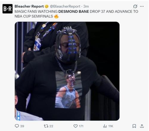 看臺上有一位魔術(shù)的球迷Cos了貝恩此前拍攝定妝照時的樣子,戴了一個黑色的面罩,貝恩一下子成為了奧蘭多的英雄。
