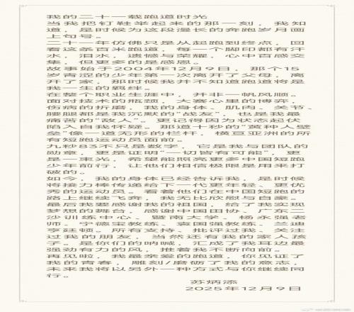 鏡頭一:2025年12月9日,田徑男子100米亞洲紀(jì)錄保持者、中國(guó)短跑名將蘇炳添宣布退役。他在自己的社交媒體上發(fā)文,回顧了自己21年田徑生涯的心路歷程。