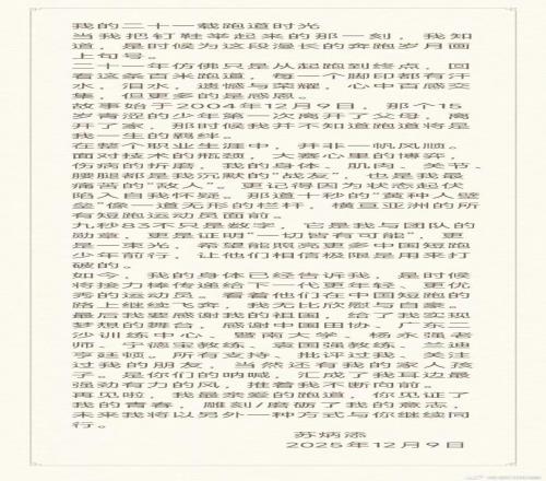 今天上午,被譽為“亞洲飛人”的男子100米亞洲紀錄保持者、短跑名將蘇炳添,通過社交媒體發(fā)表長文《我的二十一載跑道時光》,正式宣布退役。