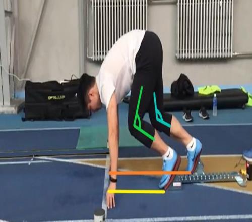 黃色線為前起跑器距離,橙色線為后起跑器距離,綠色角為預備時前置腿膝關節(jié)角度,藍色角為后置腿膝關節(jié)角度 | 視頻截圖